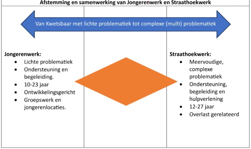 Het jongerenwerk is gericht op de begeleiding van jongeren bij het volwassen worden. Het is een laagdrempelige voorziening voor jongeren van 10 tot en met circa 23 jaar. De praktijk leert dat vooral kwetsbare jongeren gebruik maken van het jongerenwerk; er is iets aan de hand, thuis, op school of op straat. In het jongerenwerk is de behoefte van de jongeren leidend. De benadering is gericht op wat jongeren kunnen en willen leren in plaats van op wat niet lukt en op wat beter kan. Jongerenwerkers bouwen een betekenisvolle relatie en vertrouwensband op met de jongeren. Ook ouders kunnen bij de werkers terecht met vragen. De jongerenwerkers geven ouders advies en informatie over de leefwereld van de jongeren. Het straathoekwerk is van ontplooiing tot en met hulpverlening voor jongeren en (jong)volwassenen actief in de keten. Straathoekwerkers richten hun aanbod vooral op jongeren met meervoudige, complexe problemen in de leeftijd range van ongeveer 12 tot 27 jaar. Deze kwetsbare jongeren zijn vanwege hun problemen de verbinding met de samenleving kwijtgeraakt. Denk aan zorgmijders, jongeren die de criminaliteit in dreigen te gaan of waar radicalisering dreigt. Straathoekwerkers hebben expertise in het signaleren van (overlast gevend) gedrag van deze jongeren en hebben handvatten om contact met hen te maken. Zij motiveren jongeren tot het aanvaarden van hulpverlening en zorgen voor het toebleiden naar scholing en werk. Straathoekwerkers bieden naast ondersteuning en begeleiding ook hulpverlening. Zoals bemoeizorg in gezinnen, screening en toeleiding naar maatschappelijke opvang.